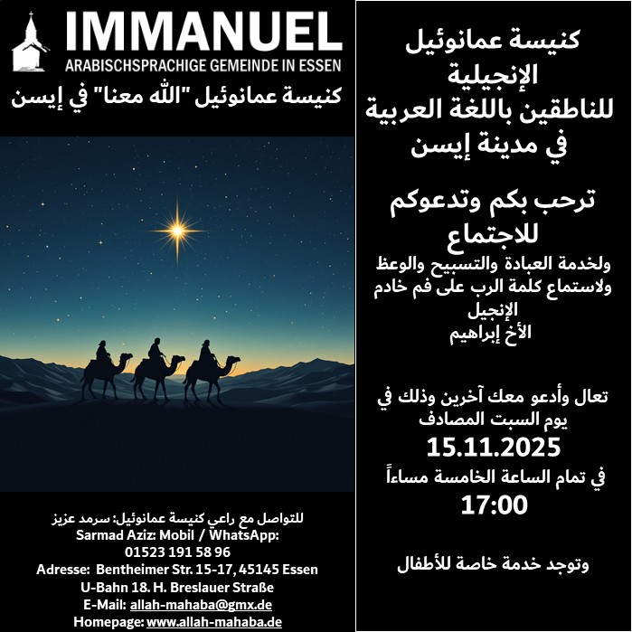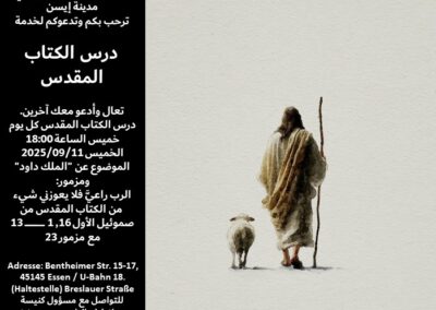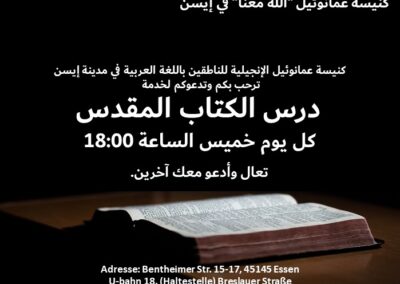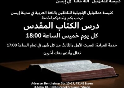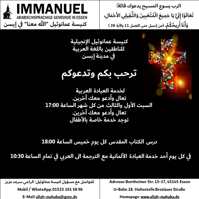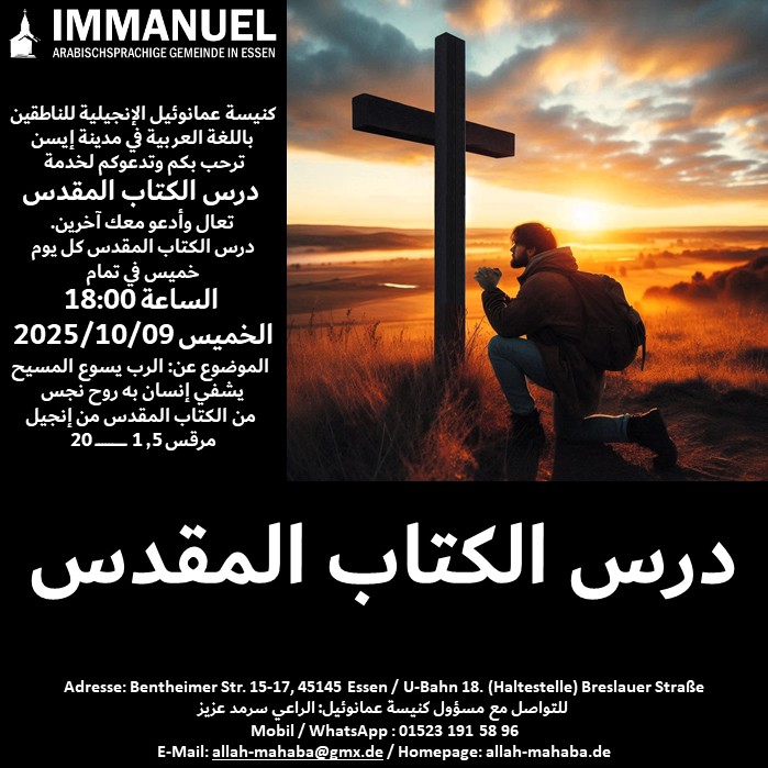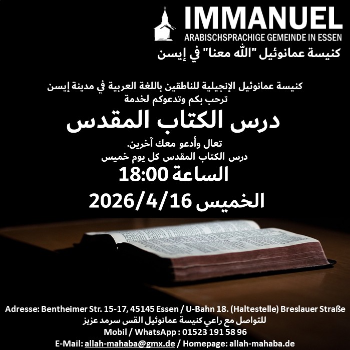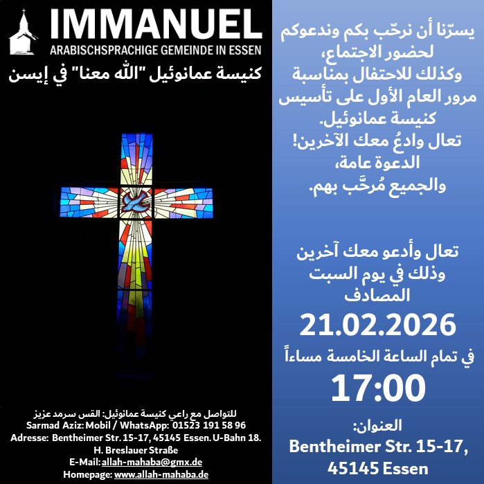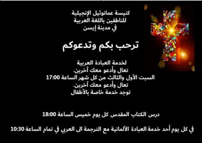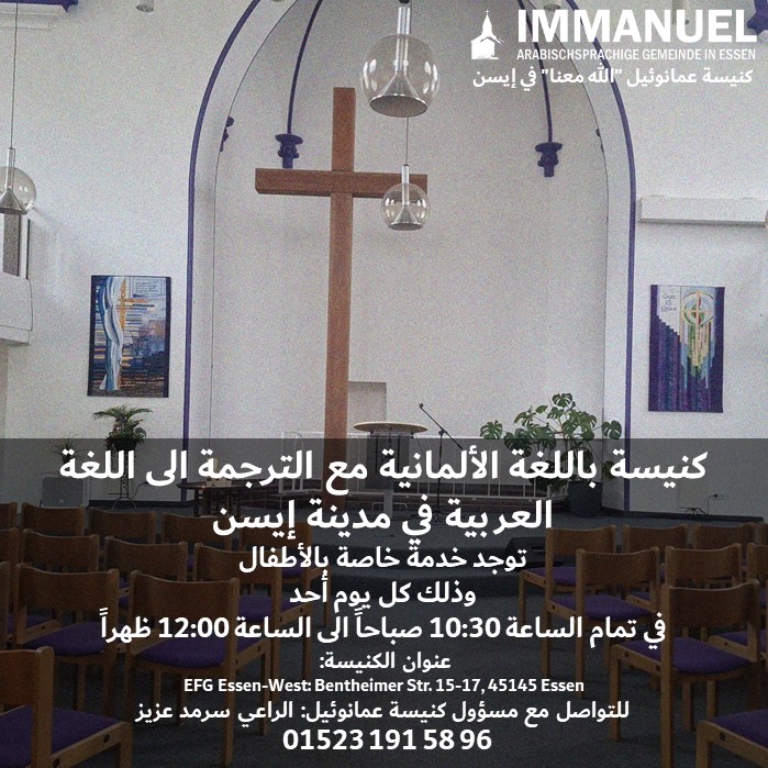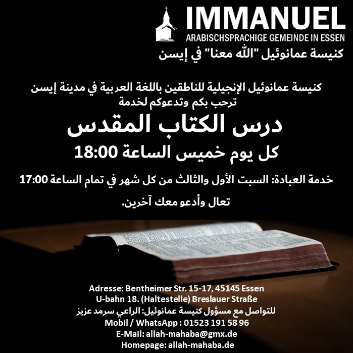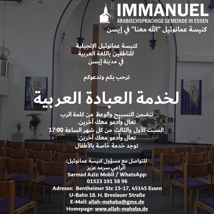 Wenn du suchst in Essen oder Umgebung einen Gottesdienst auf Arabisch, für deine arabisch-sprechenden Freunde und Nachbarn. Dann kannst du dich bei mir melden.