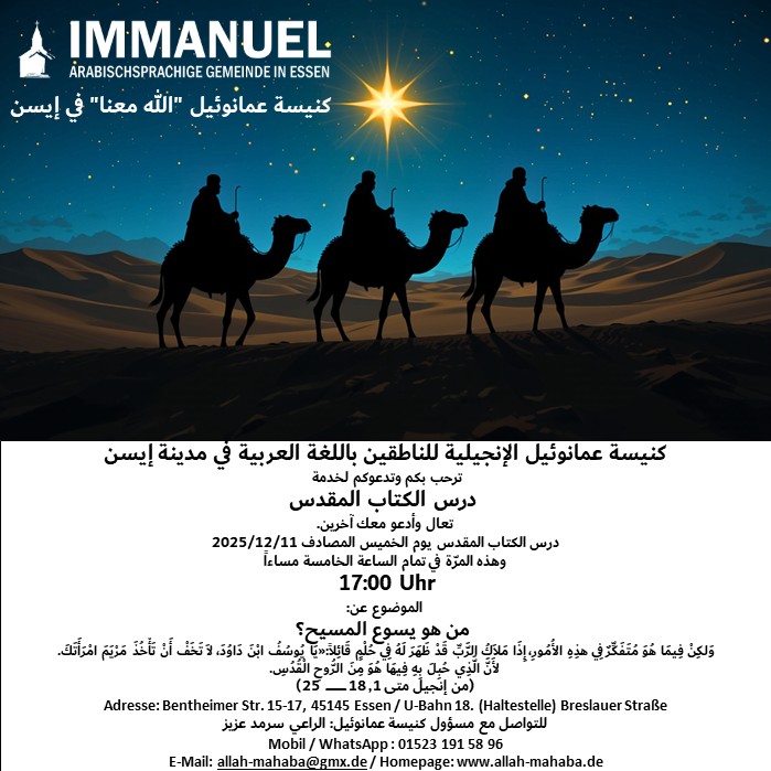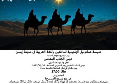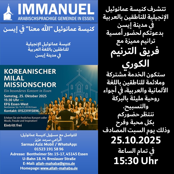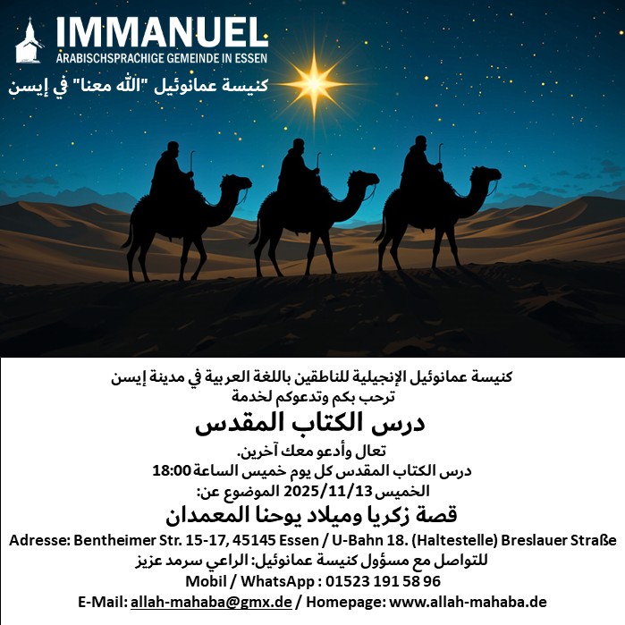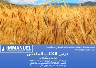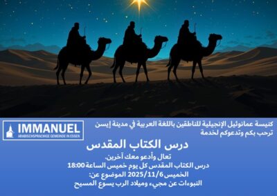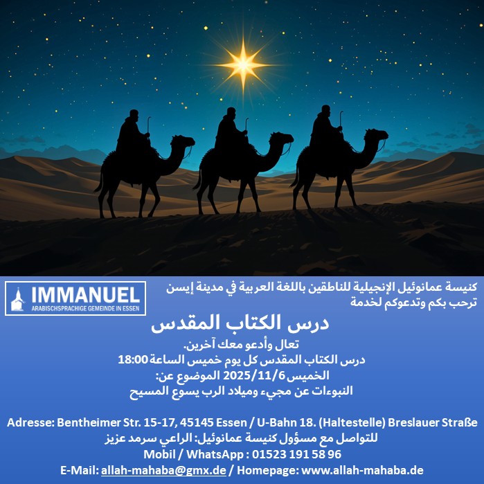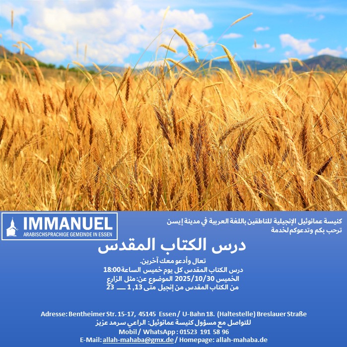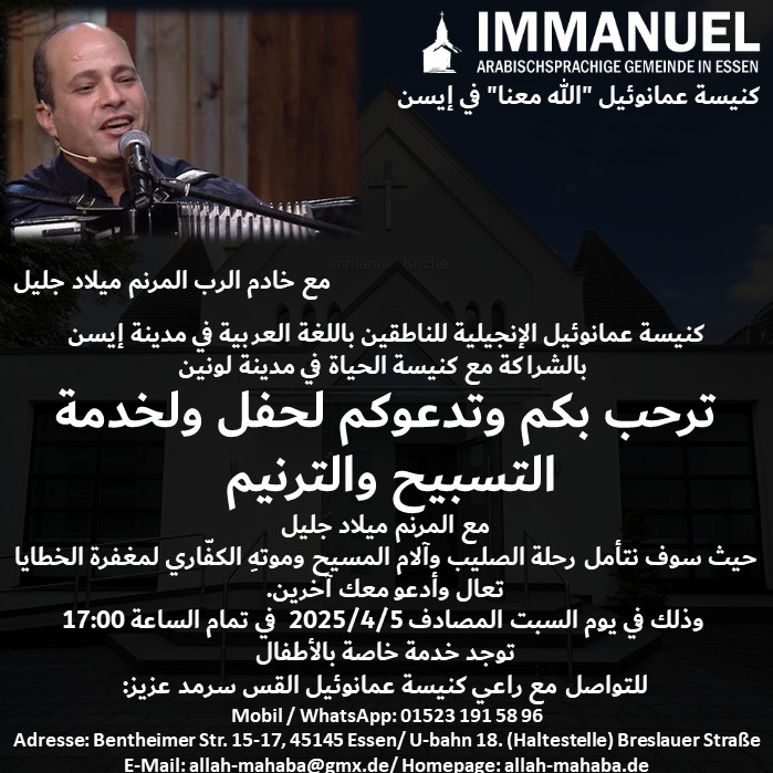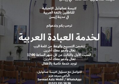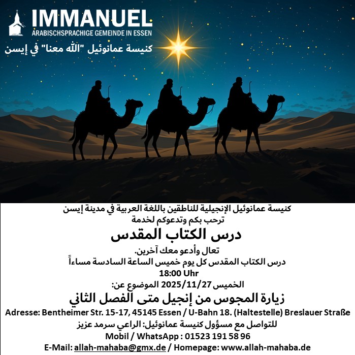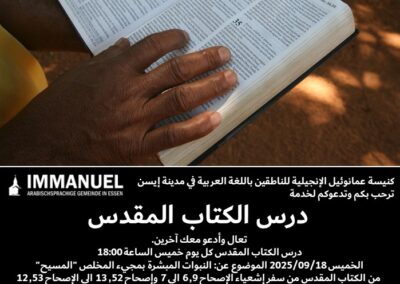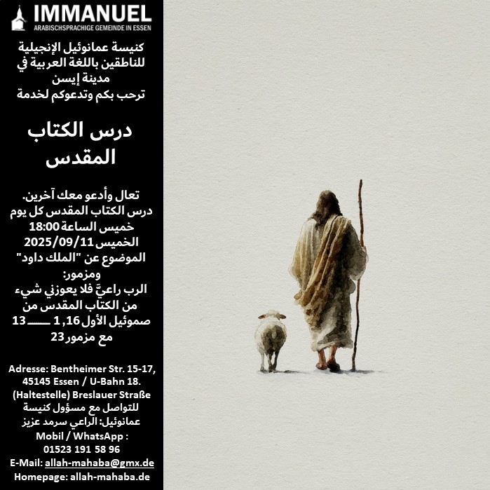 Wenn du suchst in Essen oder Umgebung einen Gottesdienst auf Arabisch, für deine arabisch-sprechenden Freunde und Nachbarn. Dann kannst du dich bei mir melden.