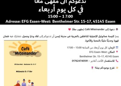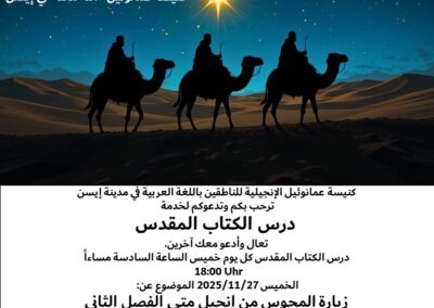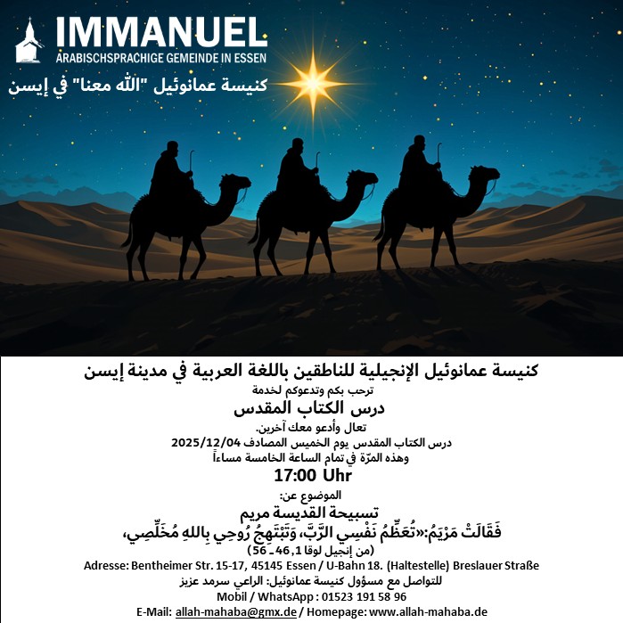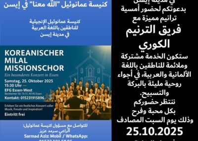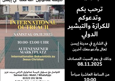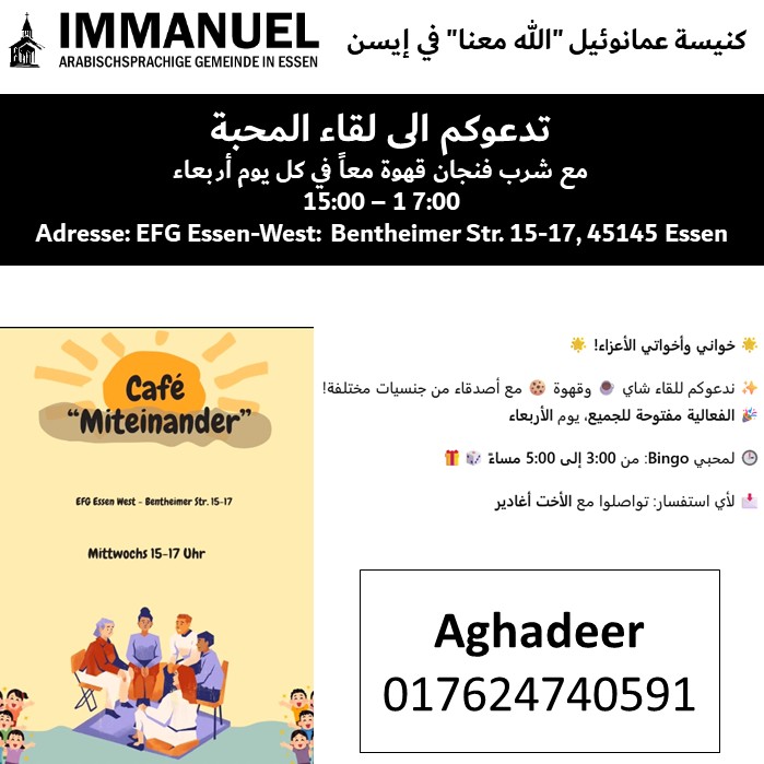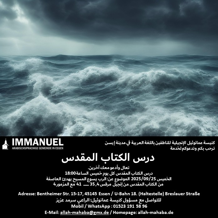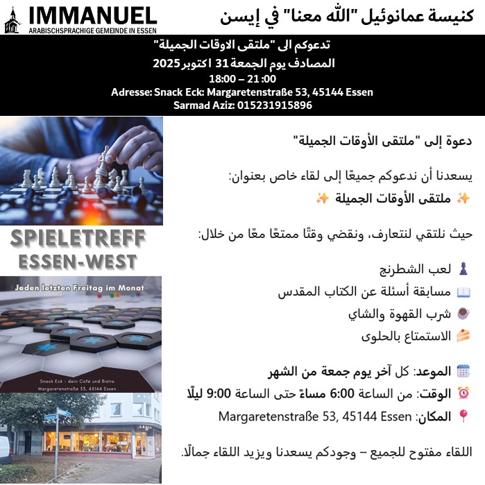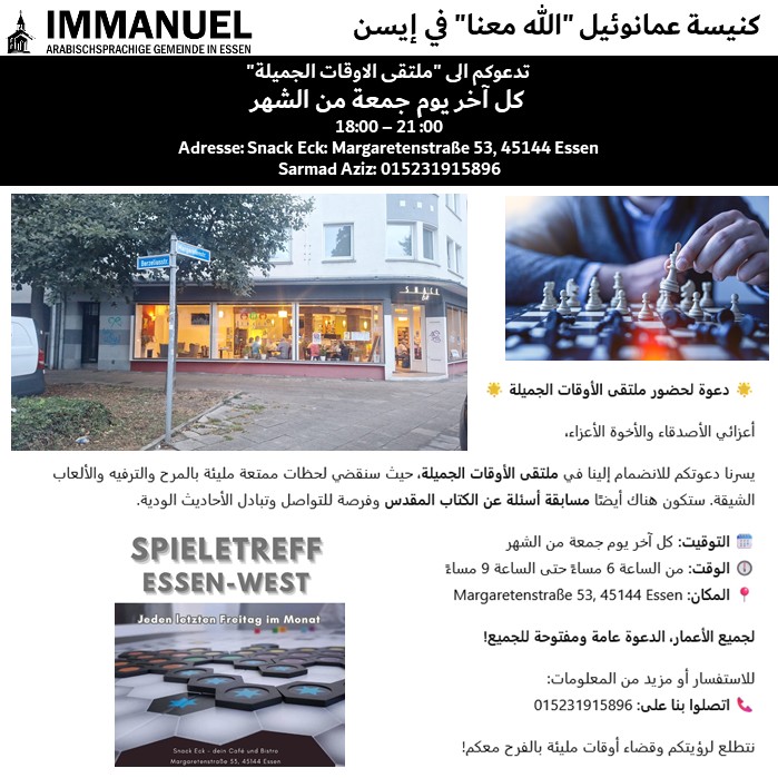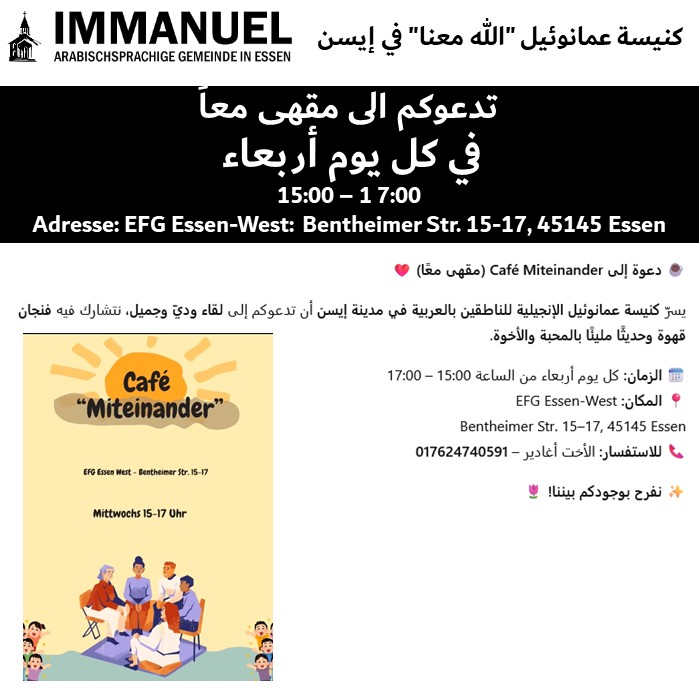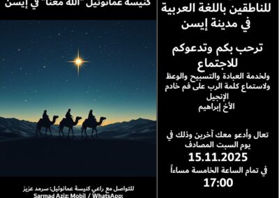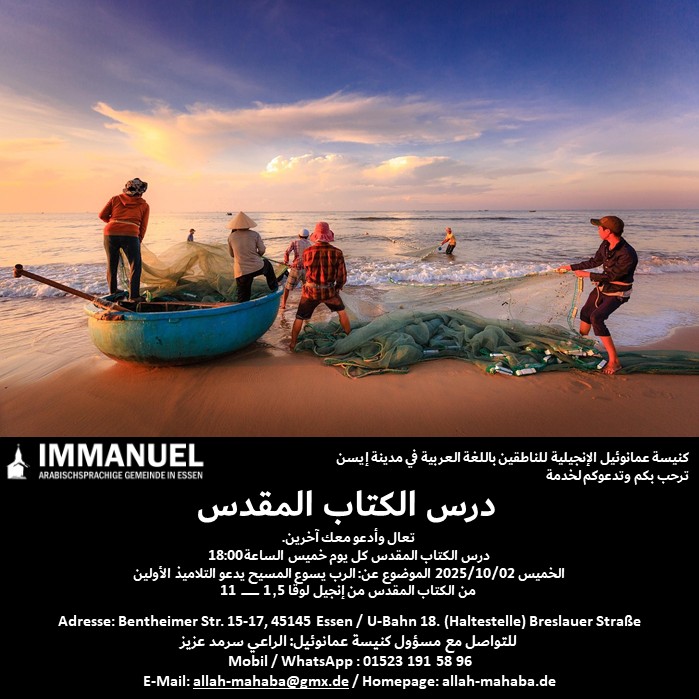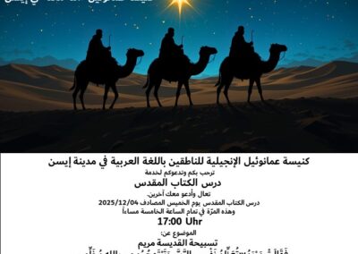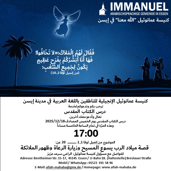 Wenn du suchst in Essen oder Umgebung einen Gottesdienst auf Arabisch, für deine arabisch-sprechenden Freunde und Nachbarn. Dann kannst du dich bei mir melden.