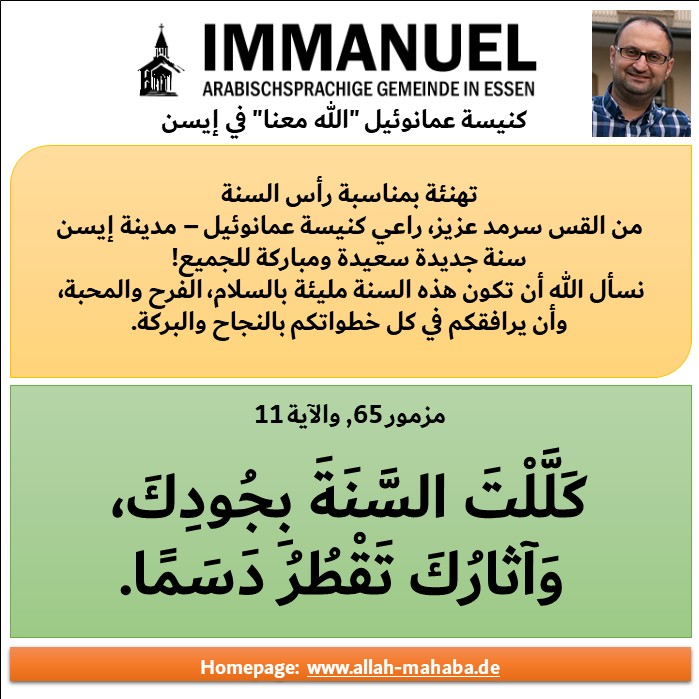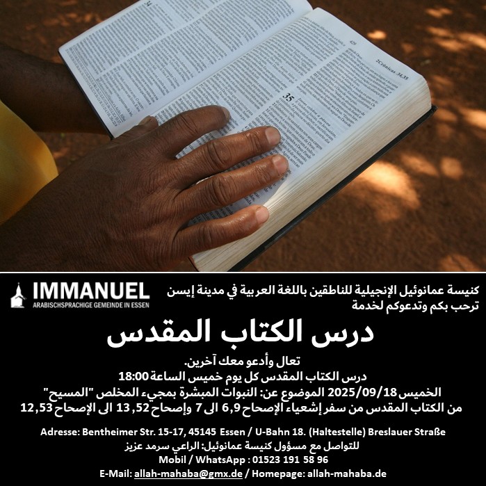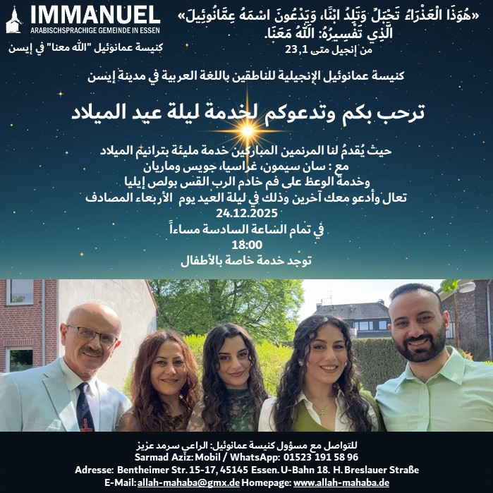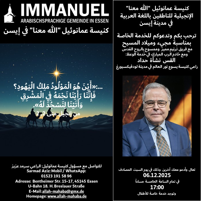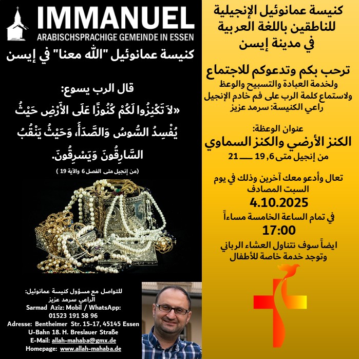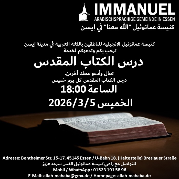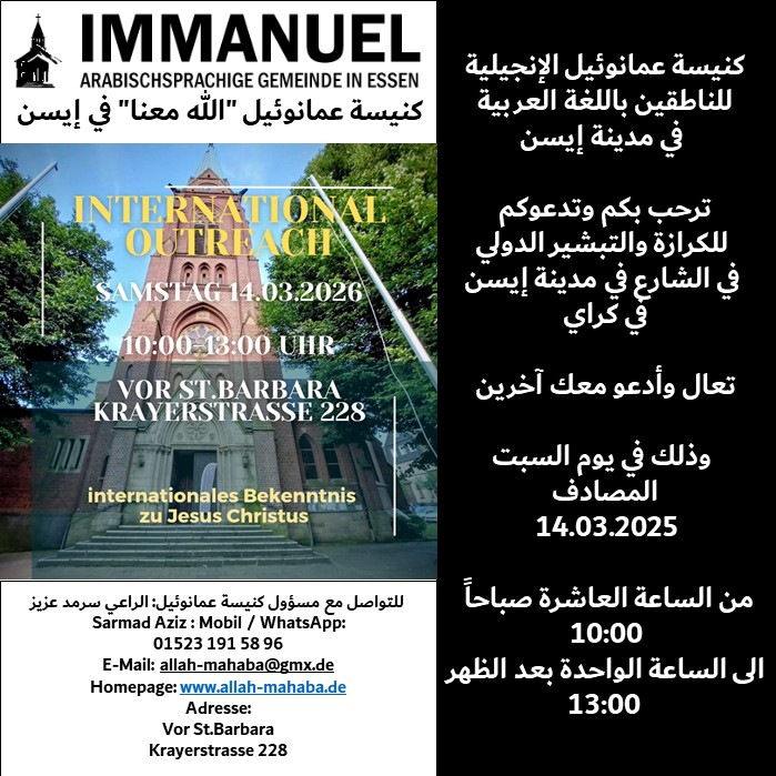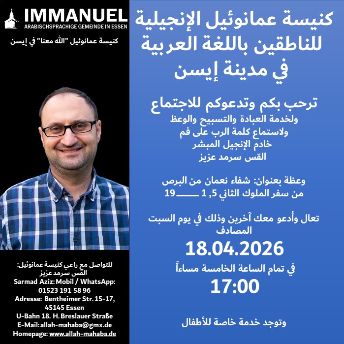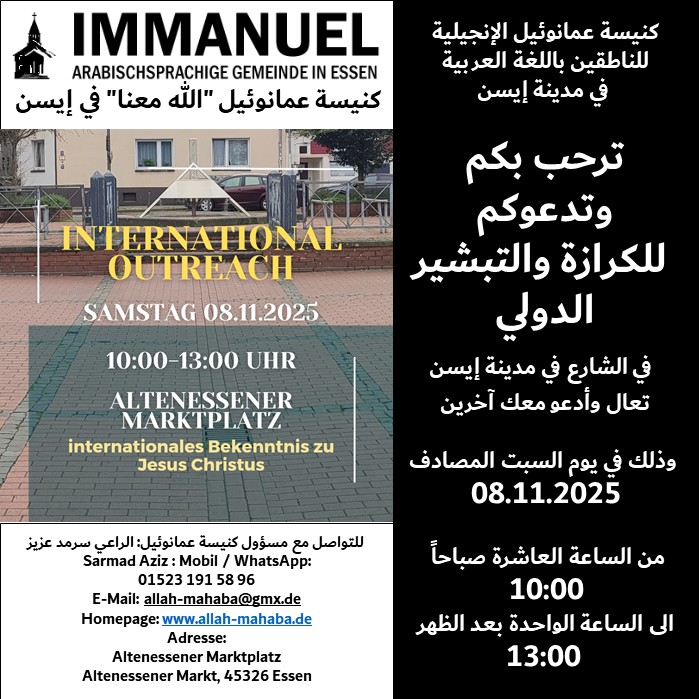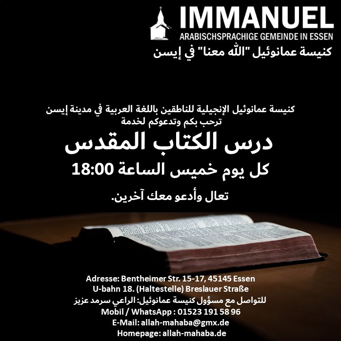 هل أنت تبحث عن كنيسة عربية انجيلية في مدينة إيسن؟ هل تحتاج الى الكتاب المقدس او الإنجيل باللغة العربية؟ هل تبحث عن اجتماع فيه تعبد الله وتصلي وتسبح الرب؟ هل تريد ان تتعمق في كلمة الرب وتعرف مشيئة الله في حياتك وتسلك بحسب وصايا الله؟انا ادعوك لكي تتواصل معي فسوف اساعدك على ذلك. تحياتي الحارة اخوكم الراعي سرمد