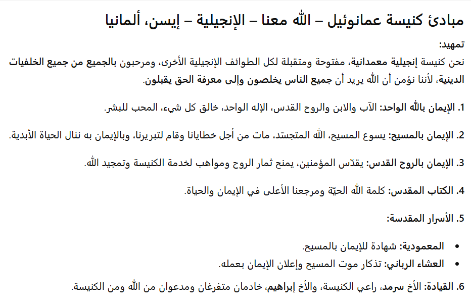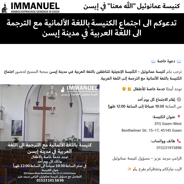 موقع صفحة الفيس بوك لكنيسة عمانوئيل إي الله معنا الكنيسة الإنجيلية للناطقين باللغة العربية في مدينة إيسن