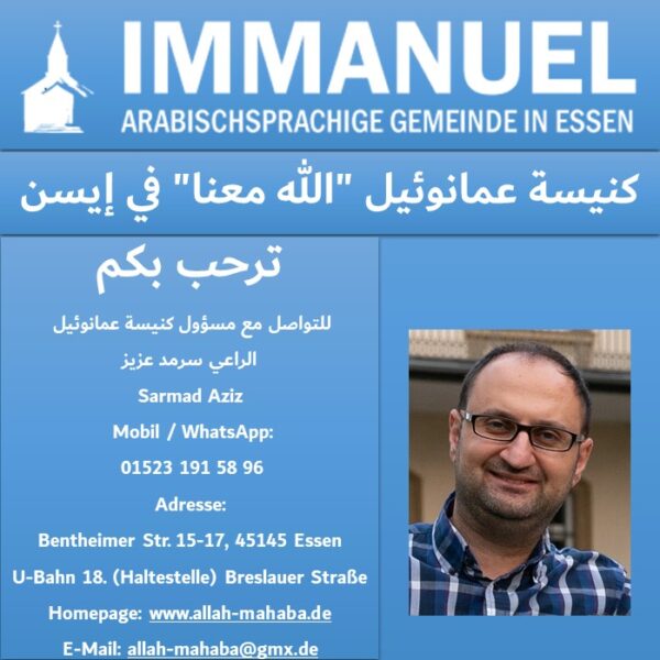 Für mehr Informationen, bitten wir euch mit dem Leiter der arabischsprachigen Immanuel Gemeinde in Essen Kontakt aufzunehmen.